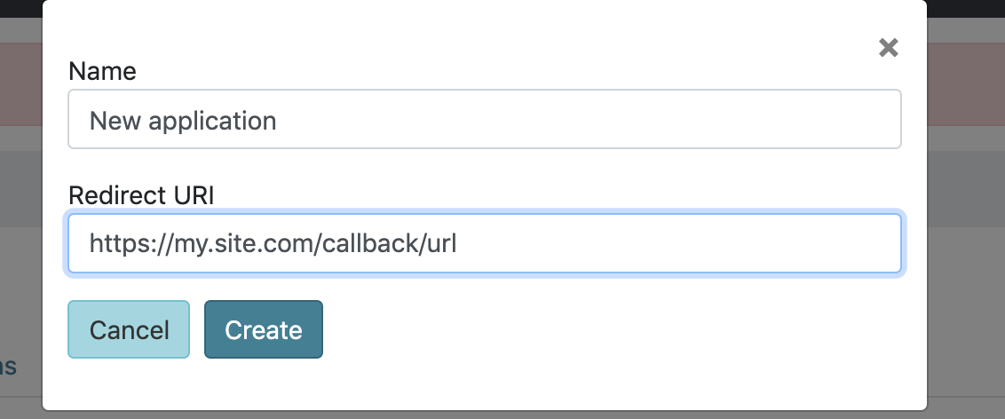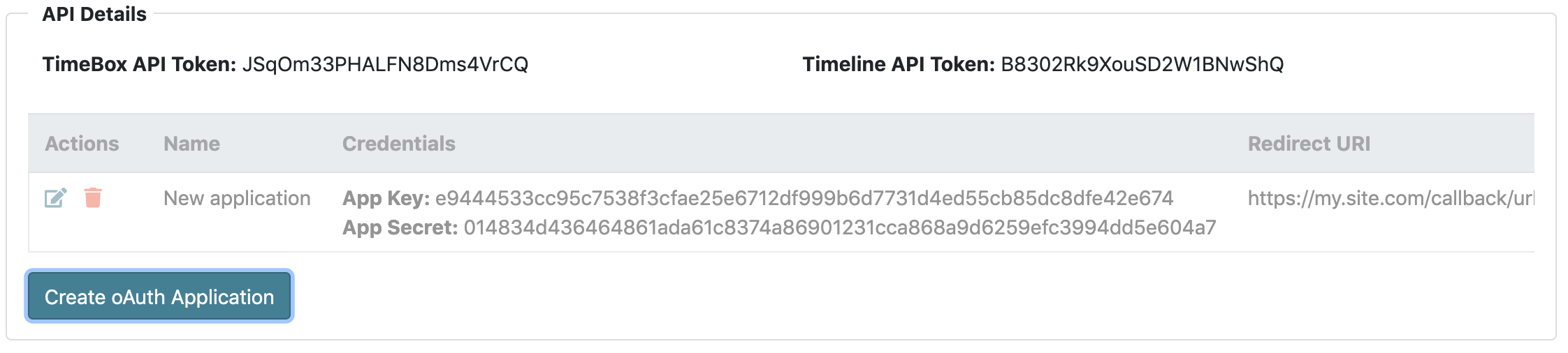 Create a new oauth application by going to Admin -> Users -> User -> API Details and clicking the Create OAuth Application button. Enter a valid application name and redirect uri, after saving you will see your all registered applications:
